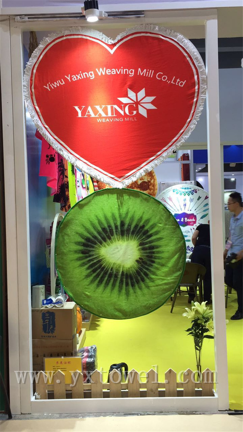 The new product of this fair is shaped towel.We received many inquiry of shaped towel after last Oct,many interesting shape,like bus car,beer bottle,slipper,strawberry,diamond,donut,hamburg and so on. So we show some shaped towels in the fair and it attracts a lot of clients,like loving heart towel with tassels, rainbow towels etc.